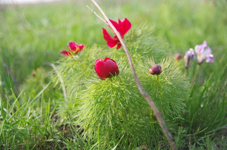 Сплошного цветения пионов пока нет, лишь на южных склонах. Бутонов тоже не особо много. Какие-то деятели устроили покос на самых цветастых в прошлые годы местах, впрочем рядом ещё есть "угодья". Тюльпанов не обнаружили ни одного (впрочем в этих местах их почти и не было).