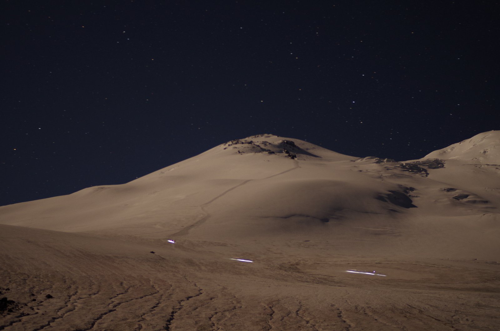 - трещины все видны, по ним через мосты натоптаны тропы. Вероятность обрушения моста во время восхождения (ночью) и возвращения (утро) - минимальна, учитывая дикие толпы ходящие по ним вечером. Поэтому мы не связывались в связки. Ледорубы тоже оставили в лагере, т.к. уклоны не такие чтобы начать скользить и не остановиться. Понимаю что это спорные утверждения, тут каждый сам для себя решит.