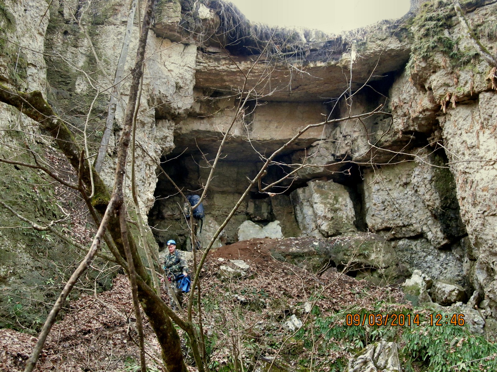 Так и есть.Вход-завал.С первого взгляда кажется что без верёвки не обойтись,но есть 2 неплохих пролаза под правой стеной.За входом зал,метров 150,ширина порядка 20-30 метров(усреднёно),высота около 10.В конце зала невысокий арочный лаз,из которого вытекает ручей.Для продвижения дальше можно(легче) проползти по нему или протиснуться в щель(в 2-х метрах выше) и остаться сухим.Вот фото входа