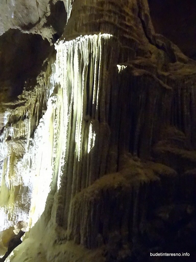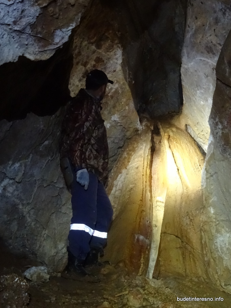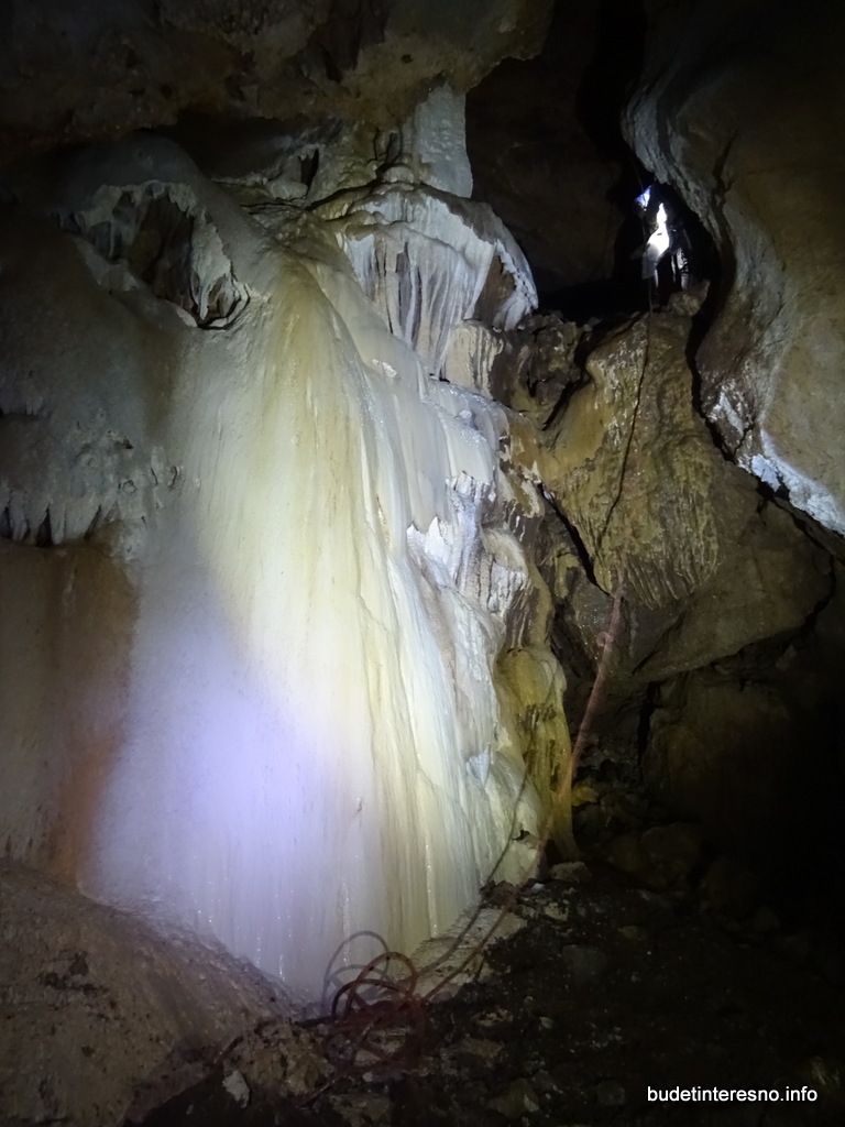 За уступом ход сужается до 2-3х метров и продолжается наклонно вниз. Есть несколько натёчных образований, среди которых выделяется приток слева, образующий вот такой натёк, на что он похож, придумайте сами