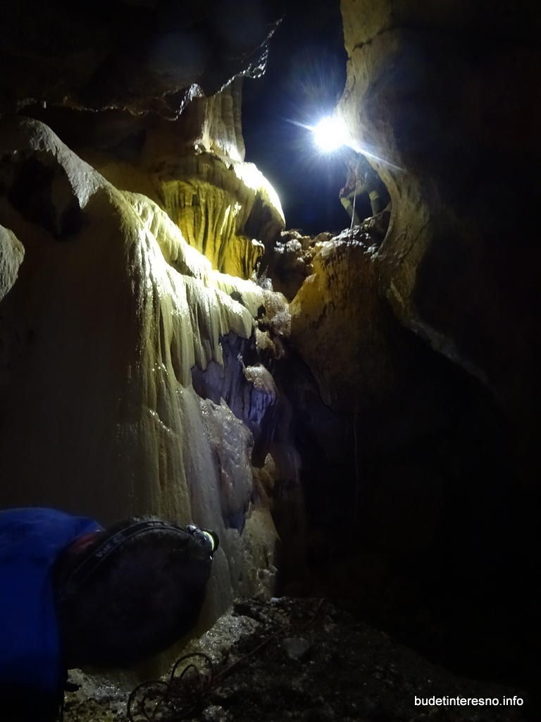 Пещера довольно любопытная. Начинается узким лазом, под углом в 30 градусов уходящим вниз по грязному полу. Почти сразу расширяется. Сначала можно встать и спуститься в зал высотой около 15 метров, шириной 5-6 метров. Справа на всю высоту колонна натёчности. Зал заканчивается уступом около 4-х метров, за которым поворот хода и виднеется продолжение пещеры. Этот уступ меня и остановил в 2016м году, т.к. без веревки спуск туда ещё можно осуществить, а вот подъём - показался проблематичным. В 2017 прошли туда уже с минимальным набором снаряги. Веревка отлично крепится за натёк (сталагмит) слева перед спуском. И да, без веревки я бы лично вряд ли бы поднялся наверх, да и жумар тоже весьма желателен.
