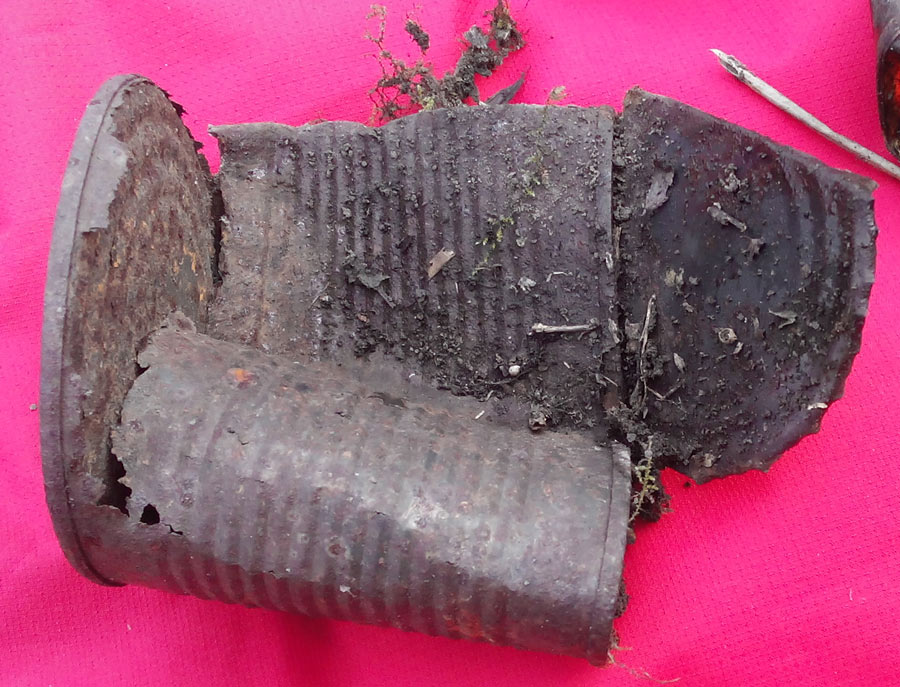 Несмотря на отмеченную точку, не без труда отыскал банки. Заросли и осенняя листва. Плюс, оказалось, что их отыскал ранее кто-то ещё, опять наступив. Скорее всего копатели в поисках артефактов.