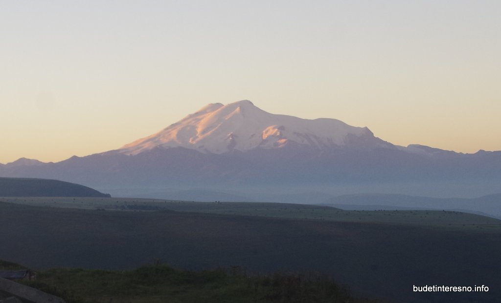 Погода в первый день не обещала ничего плохого. Нулевая облачность, шикарный вид на Эльбрус от кафе на Гумбаши (рассвет):